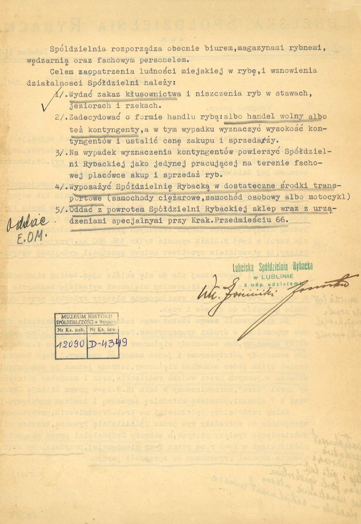 Interesujący dokument, jeszcze z 1944 roku, dokładna data została podana na samym dokumencie. Spółdzielnia zajmowała się skupem, przerobem i sprzedażą ryb hodowlanych słodkowodnych.