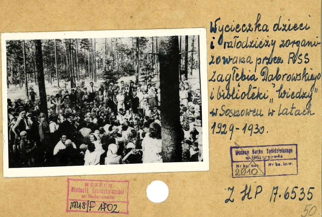 Wycieczka dzieci i młodzieży zorganizowana przez Robotniczą Spółdzielnię Spożywczą "Zagłębia Dąbrowskiego" (RSS „Zagłębia Dąbrowskiego”) oraz spółdzielczą Bibliotekę „Wiedza” w Sosnowcu. „Gdzieś” w latach 1929-1930.
