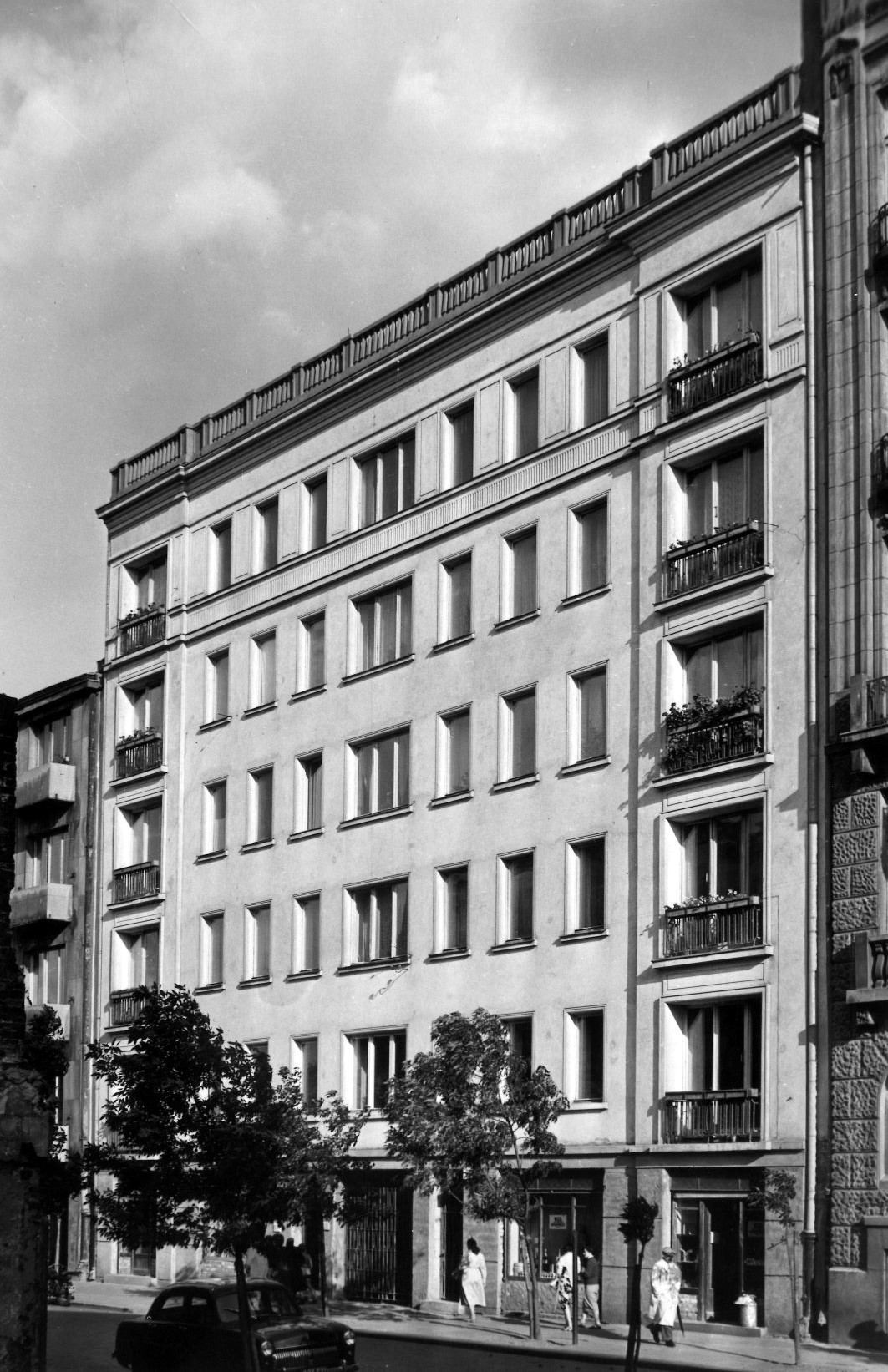 Dom, którego budowę ukończono w 1955 roku, wybudowany przez Spółdzielnię Mieszkaniową „Stolica” przy ul. Hożej 47. Autor zdjęcia jest nieznany, zaznaczono jednak na jego odwrocie, że były w nim dostępne różnej wielkości mieszkania.