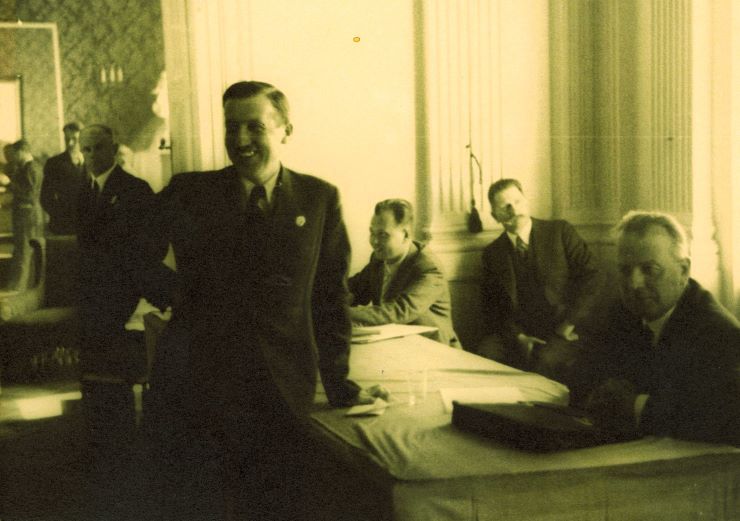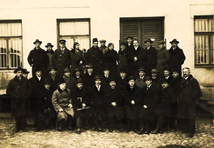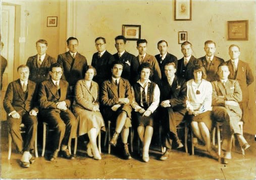 Konferencja lustratorów Związku Spółdzielni Spożywców RP, późniejszego „Społem”. Zdjęcie wykonano w Warszawie, „w okolicach” 1927 lub 1928 roku; związek działał jeszcze pod nazwą bez uzupełnienia "Społem".